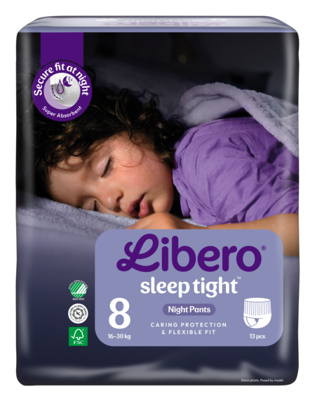 Libero SleepTight är en diskret nattblöja som passar bra vid sängvätning hos barn. Håller barnet torrt tack vare en superabsorberande kärna som kapslar in vätska och lukt. De mjuka och följsamma materialen är skonsamma mot huden. Byxan, som har en diskret design, känns och ser ut ungefär som underbyxor. Finns tillgänglig i storlekar från 16 till 60 kg. Svanenmärkt och rekommenderad av Asthma Allergy Nordic.